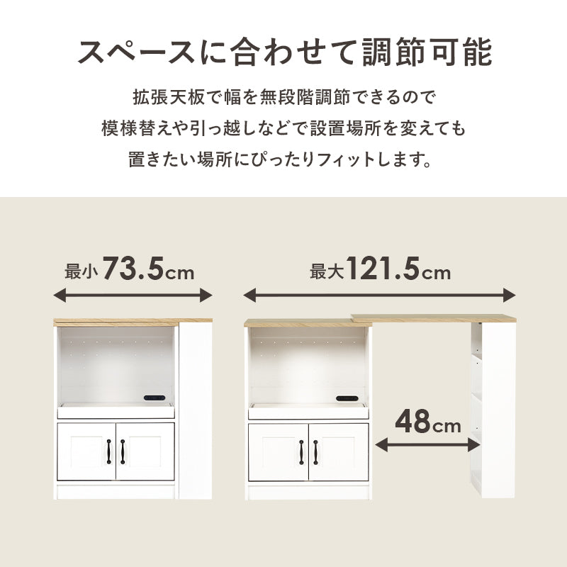 キッチン関連のものを一か所にまとめることで、探す手間を軽減させます。カウンターは伸縮性で好みに応じて横幅を調節出来たり、側面には物を収納させることが出来ます。