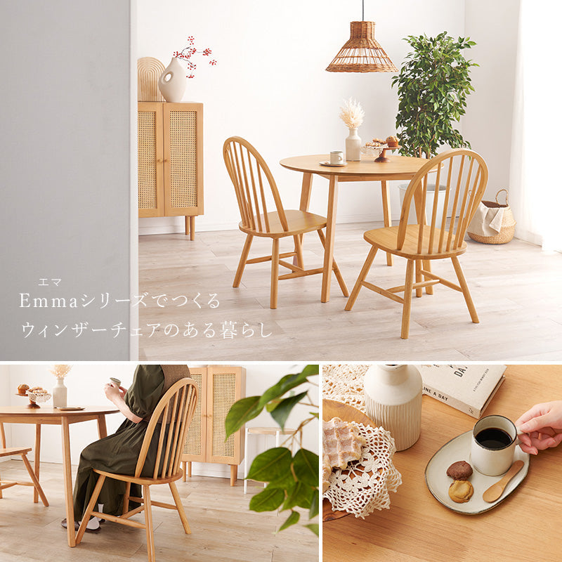 木製の温かみとおしゃれなデザインのダイニングシリーズ「エマ」。 丸みのある可愛らしいフォルムのダイニングテーブルと、 イギリスで生まれた伝統的な椅子「ウィンザーチェア」の3点セットです。 北欧風、カントリー風、アンティーク風などさまざまなテイストのインテリアにマッチします。 テーブルのサイズは食事や勉強・仕事などの作業に使いやすい直径90cm。 1人用暮らし〜2人暮らしにおすすめのコンパクトサイズなので、 賃貸アパートやマンションなど狭いお部屋でもお使いいただけます。 チェアのデザインは背中にフィットする背もたれと広めの座面設計で、 座り心地にもこだわっています。