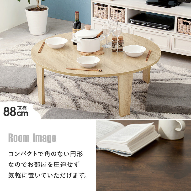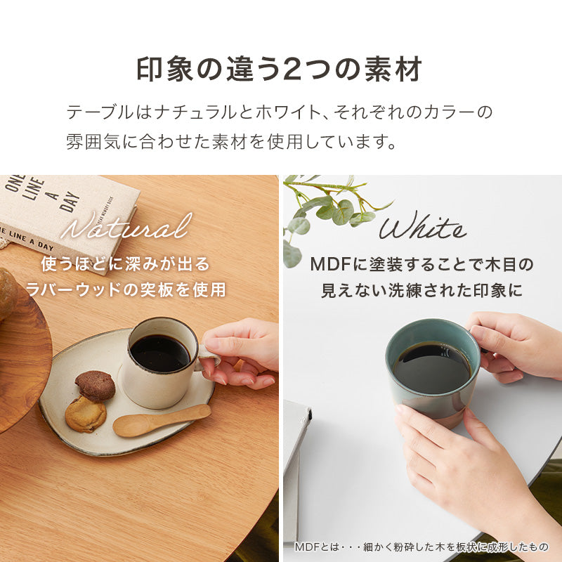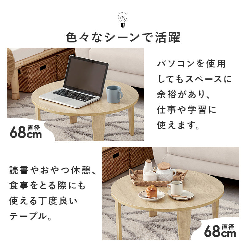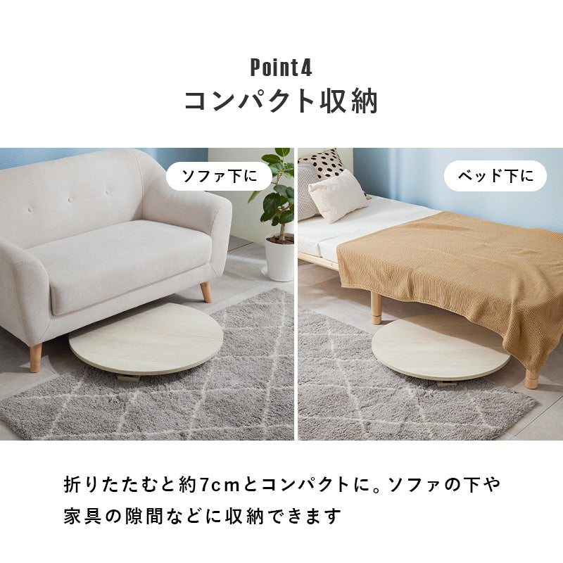 リアルな古木調シートを使用した丸型天板と、 スタイリッシュな脚を組み合わせた折り畳みテーブル。 コンパクトなので1人暮らしなどのワンルームや狭いお部屋、キッズルームなどにおすすめ。また折りたたみ脚なので、ソファ下やちょっとした隙間に収納することもできます。 来客時のサブテーブルやリモートワーク用としても活躍。