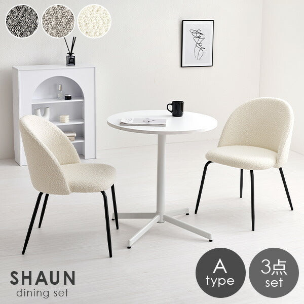 ダイニングチェア2脚とホワイトカフェテーブルの3点セット。 ぽこぽことした質感が特徴的なブークレ生地は 毛足が短くさらりとした触り心地なのでオールシーズン快適にご利用いただけます。 細身のフレーム脚は光沢感を抑えたマットな質感でスタイリッシュな印象に。 真っ白な丸型カフェテーブルはお部屋を明るく印象付け、チェアの存在を引き立てます。