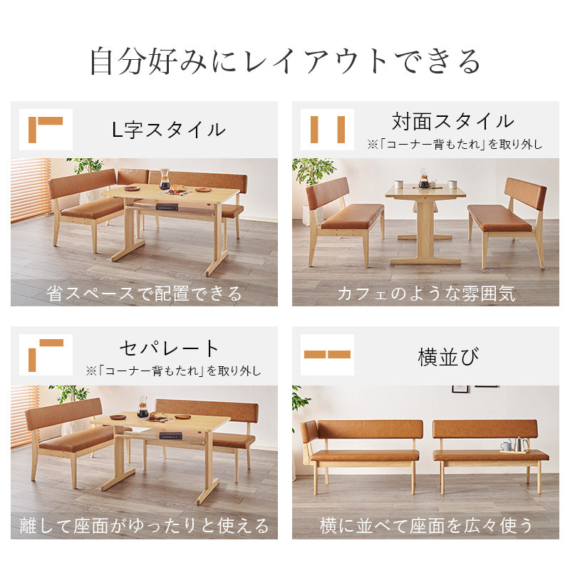 テーブルを囲むようにしてコーナーソファを配置することで、みんなで向かい合って座れる大人数のダイニングに対応。大家族やパーティー用、食事の時間帯が異なる家族の団らんの場所づくりにも。