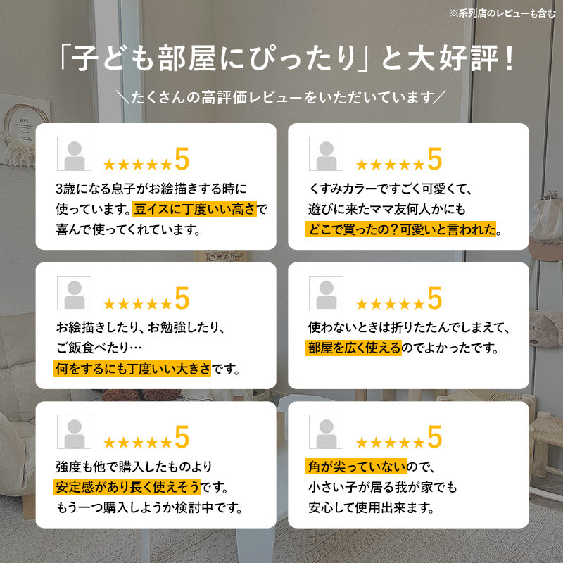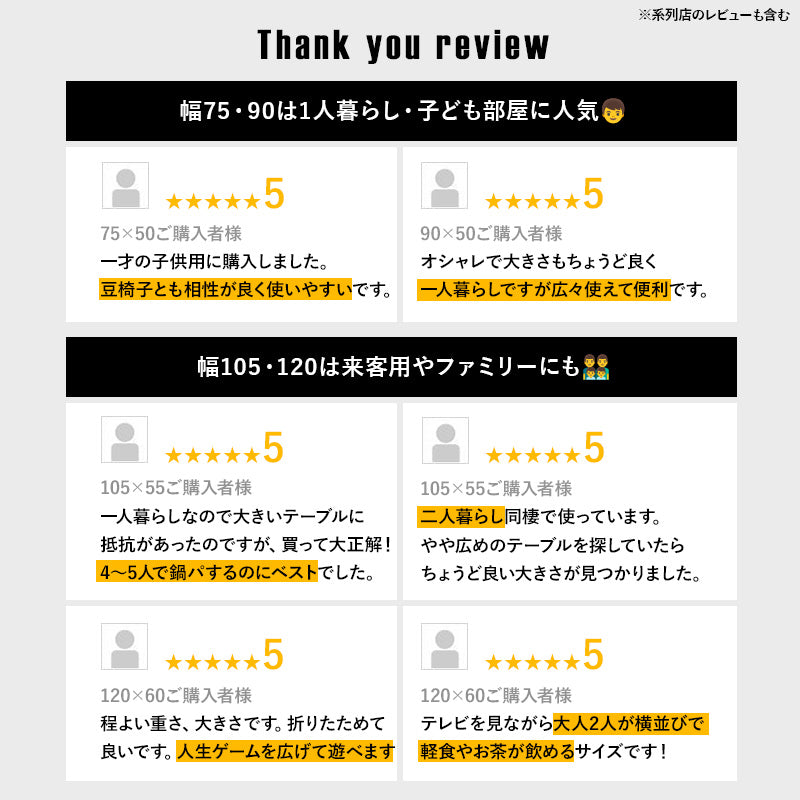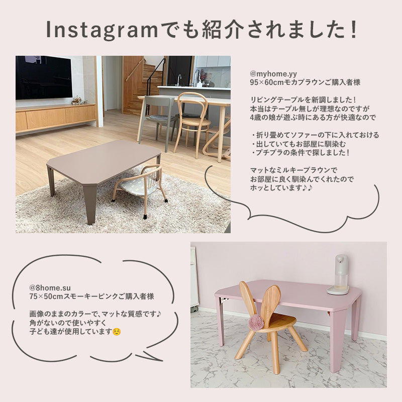 ご購入者様くすみカラー&艶消しがおしゃれ幅90スモーキーピンクを購入しました。大人かわいいくすみカラーでつや消しの折りたたみテーブルはなかなか見たことがなく、こちらでは色が選べるのも嬉しいですし、届いてからもやっぱり色が可愛く娘4歳2歳もとても気に入っています。
