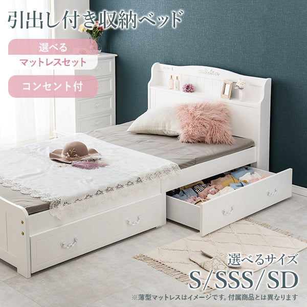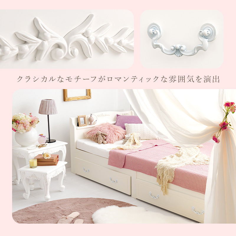 工具不要&面倒な組立て不要! 約3分の簡単組立てがうれしい、すのこベッド「ネジレス」に可愛いホワイトベッドが登場。 クラシカルなモチーフや曲線のデザインが、女の子らしい姫系インテリアにぴったり。 引き出しは、キャスター付きで開閉がスムーズ。 左右入替えも可能なので、スペースが限られるお部屋や賃貸にも! 耐荷重も約200kgなので安心! 解体も簡単に行えるので、引っ越しの多い方にもおすすめです!
