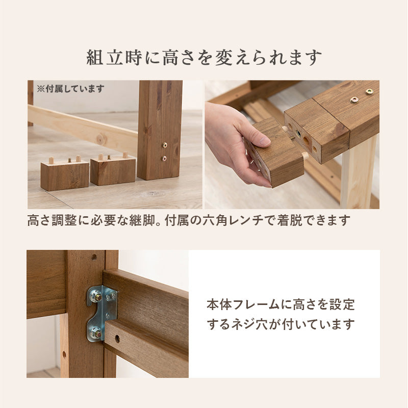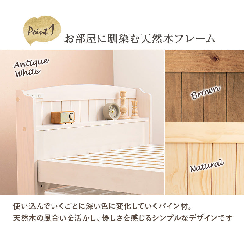 カントリー調デザインと天然木の素朴さがゆとりのある暮らしを演出してくれる『すのこベッド』 ・ベッド下は最大高さ51cmの脚長・大容量タイプ! ・天然木の質感を楽しめるナチュラル、アンティークホワイト、ブラウンの3色からお選びいただけます。 ・高さは3段階調整できるので、ライフスタイルに合わせてお使いいただけます。 ベッド下は大容量収納に! ・床板は 「すのこ」を採用!年中ずっと快適♪すのこは4枚に分かれます ・お気軽の敷き布団が使えるので、マットレスを買い足す必要がありますがありません ・ずっとの充電や小物も置ける、便利なコンセント棚付き ・桟木が多い有料タイプのすのこで強度も安心