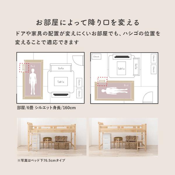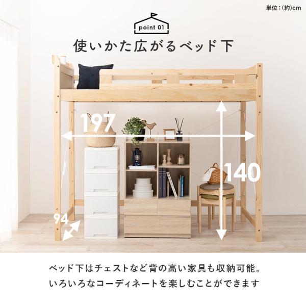 天然木パイン材を贅沢に使用した、おしゃれな北欧風木製ロフトベッド。 ベッド下は140cmあるので大容量の収納スペース。かさばるものを収納でき、賃貸やアパート、マンション、一人部屋などの収納不足も解消します。 子供部屋はもちろん、一人暮らしやワンルームなどの狭い部屋で大人用にもお使いいただけるサイズです。耐荷重350kgの頑丈タイプなので大人でも安心! 便利な2口コンセント付き宮棚と、コートや洋服をかけられるフック付き。ハシゴの位置は4方向に変えられるのでお部屋に合わせて設置可能。 お手持ちの敷き布団が使えるのでマットレスを買い足す必要もありません。