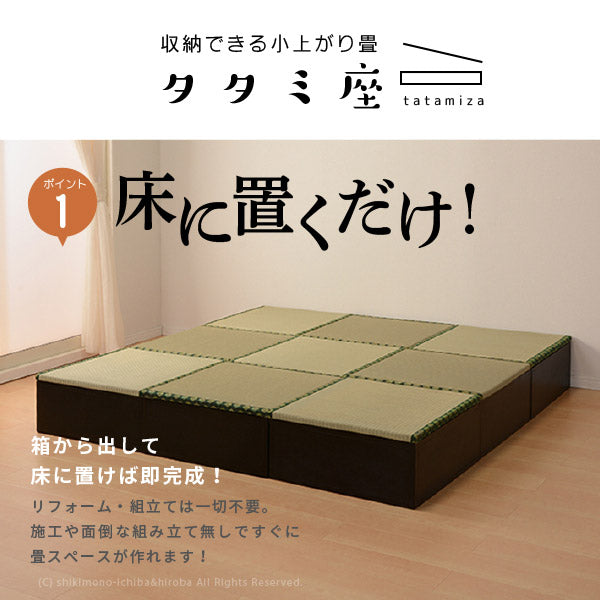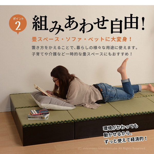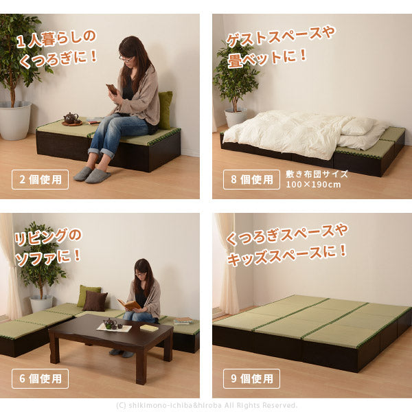 置き畳とは、フローリング床の上に置いて使う畳。洋室でも和室気分を感じたい時に、置くだけで気軽にい草の心地よさを楽しむことができます。正方形の形をしているものが多く、置きたい場所に敷き詰めて使います。