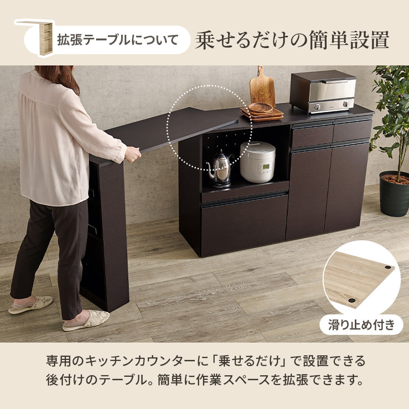 拡張テーブルを使用することで、キッチンカウンターの横幅を広げられたり、足元の空間を確保することができます。使わないときはコンパクトに収納できるので、一人暮らしにもぴったり。