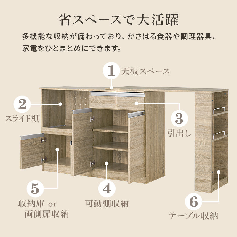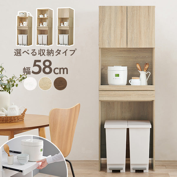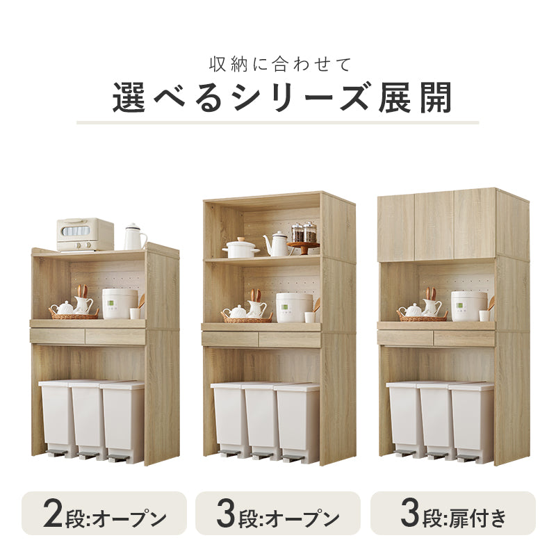 例えば、食器棚として使いたい場合は、扉付き収納や引き出しがついているものがおすすめ。キッチン家電を沢山設置したい場合は、オープンラックかつ、スライド棚やコンセントや通気穴があるものを選ぶと、快適なキッチン空間になるでしょう。
