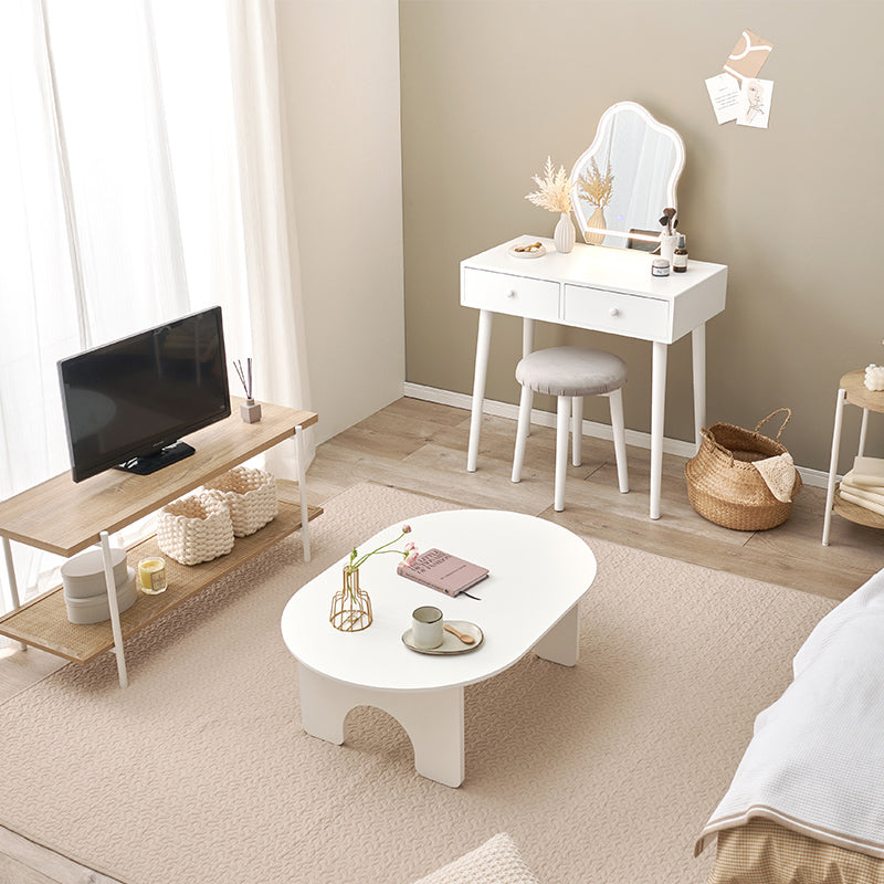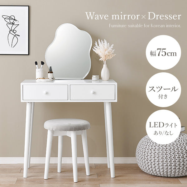 ウェーブミラーや女優ミラーがついた、シンプルなホワイト系または木目調のドレッサーを取り入れるのがおすすめ。ロースタイルにあわせて、ドレッサーテーブルやコスメワゴン・ボックスなどを取り入れるのもgood。