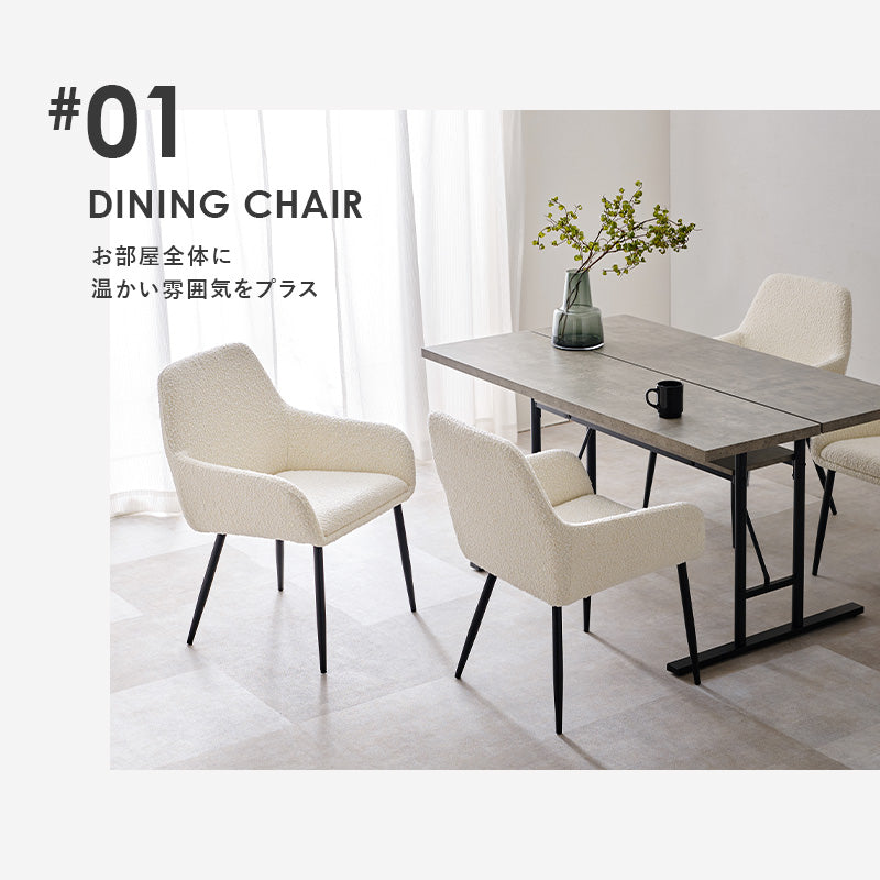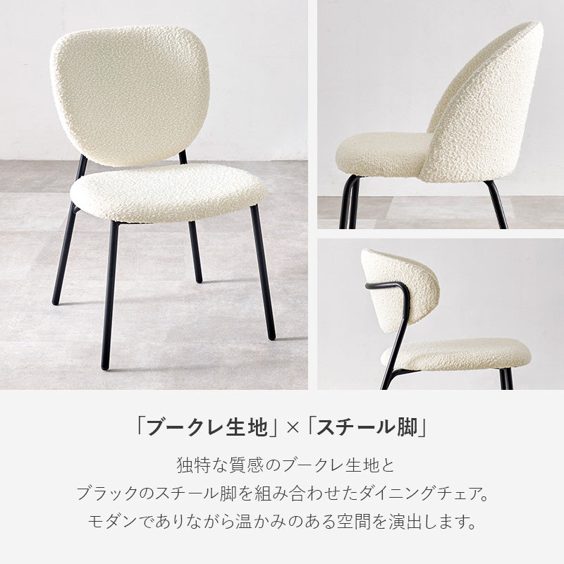 チェアはブークレ調の生地で、柔らかな質感がプラスされ、モノトーンでも冷たくならずに、どこか可愛い心地よい印象に。