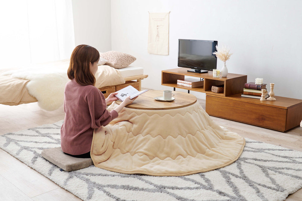 円形のこたつテーブルは、コンパクトで一人暮らしにも置きやすいのに加え、丸みが優しい雰囲気を与える点が魅力。こたつ布団も円形のものを選んで、丸みの良さをさらに引き出しましょう。