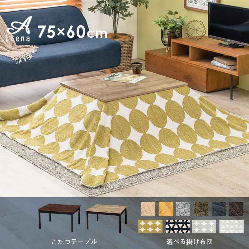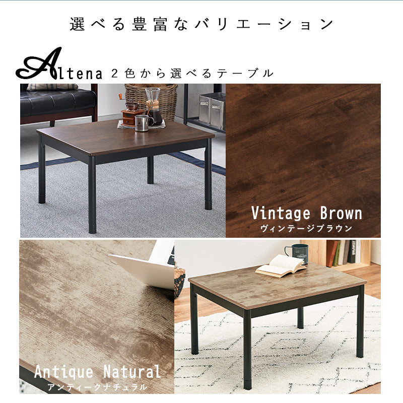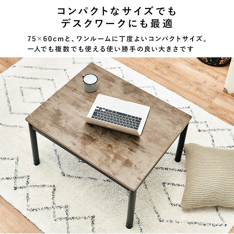 男前なヴィンテージ風、カフェのようなアンティーク風、 2つのテイストから選べるこたつテーブル。 75×60cmとワンルームに考えよいコンパクトサイズで、一人暮らしでも使いやすい来客時にも困りません。 はPCを置いて作業ができる広さなので、 デスクワーク、在宅ワークにもおすすめです。