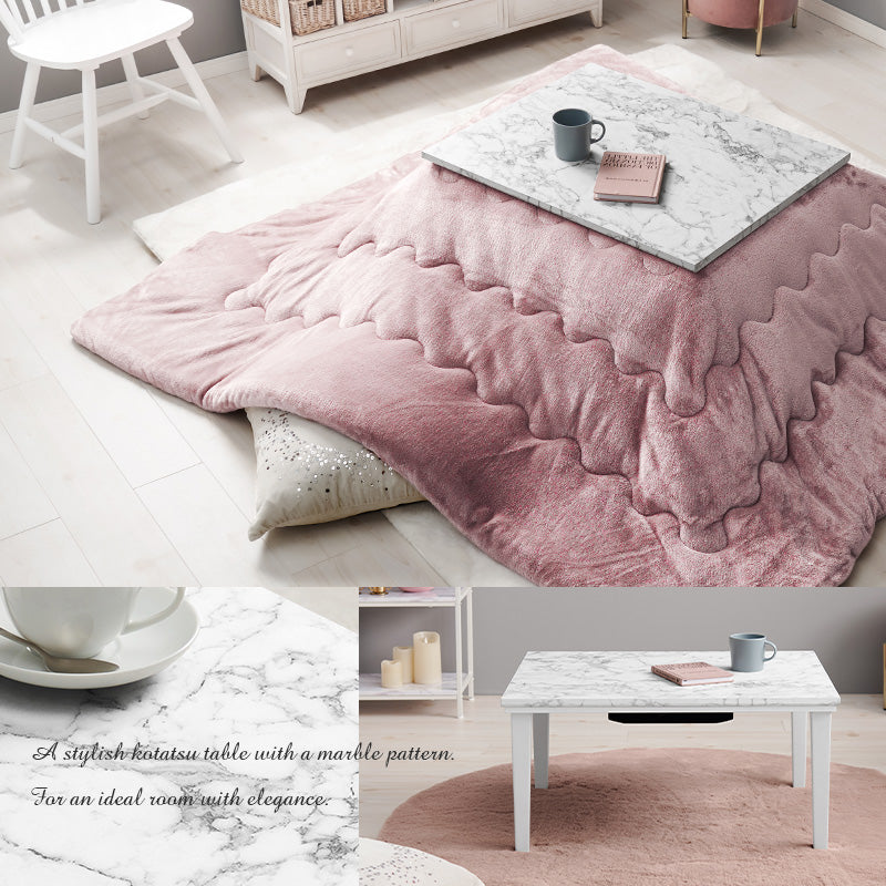 木目調のこたつはピンクや姫系やホワイトインテリアなど、フェミニンなお部屋で浮きがち。「こたつを使いたいけれど、可愛さも妥協できない……!」という時は、エレガントな大理石調テーブルのこたつがおすすめです。こたつ布団もホワイトにすることで、こたつっぽい雰囲気が抑えられておしゃれに馴染みます。