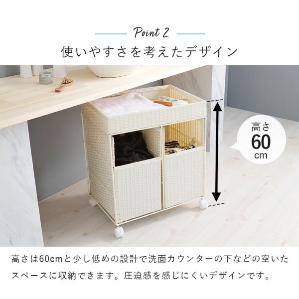カゴよりも大容量で、狭いランドリー空間のなかでも縦の空間を上手くつかって衣類をすっきり収納することができます! 隠す収納タイプのものを選べば、生活感を抑えられるのも嬉しいポイントです。