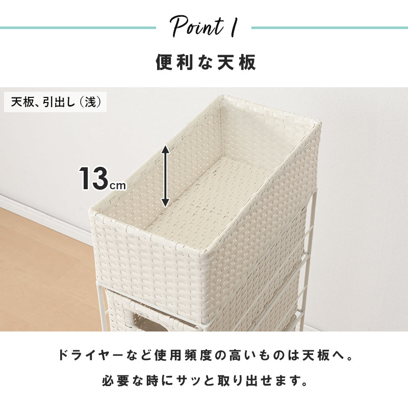 すっきりとしたデザインで、洗濯機横や脱衣所のちょっとしたスペースに置きやすいです。