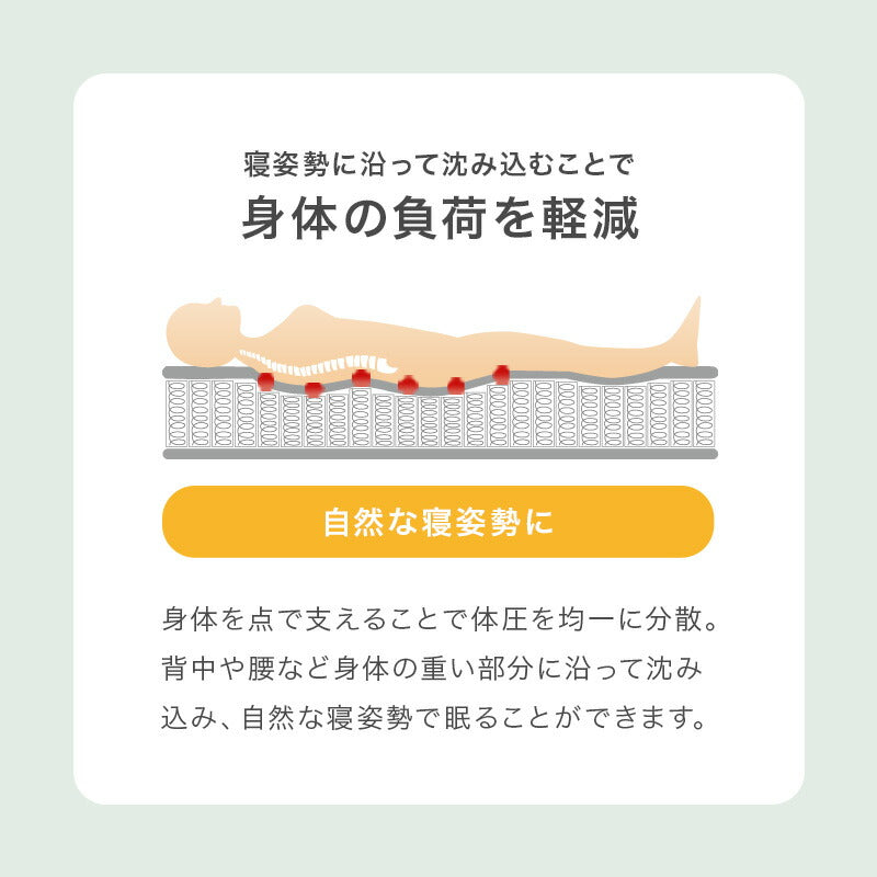 点で支えるので、体重のかかる所だけが沈み込みます。そのため、背中や腰など身体の重い部分に沿って沈み込み、自然な寝姿勢で眠ることができます。