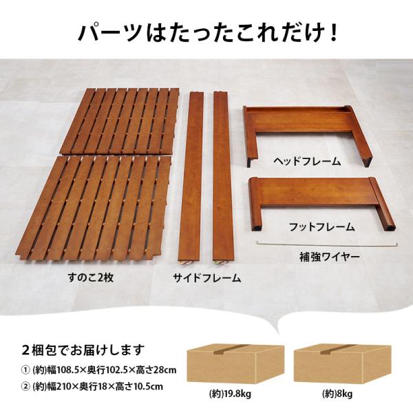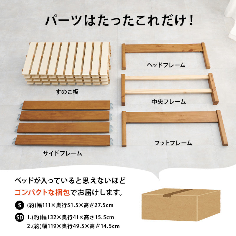 工具不要で簡単に組み立てられる・天然木を使用している点は他のネジレスベッドと同じですが、ヘッドボードのみのシンプルなデザインです。耐荷重200kg。