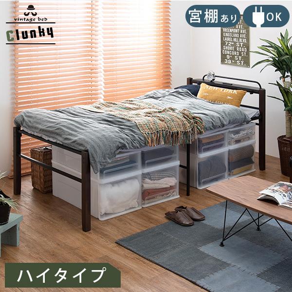 [シングル] 木脚パイプベッド ハイタイプ 宮棚コンセント付き Clunky(フレーム単品)