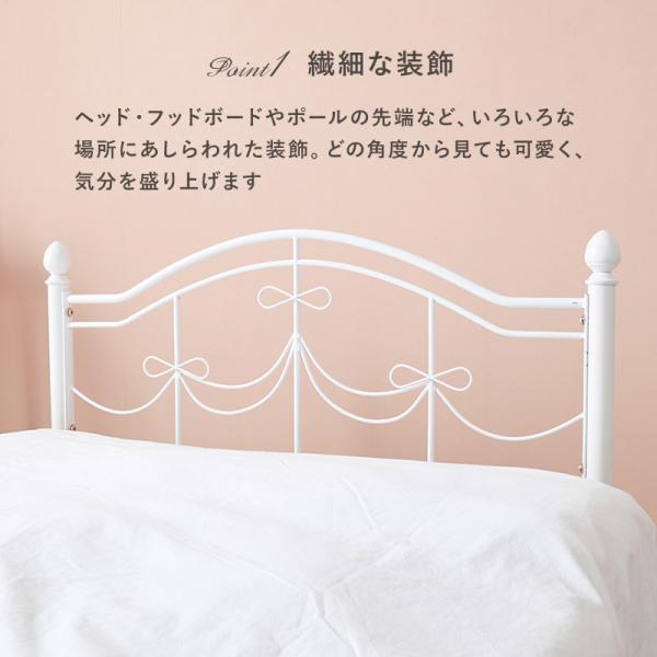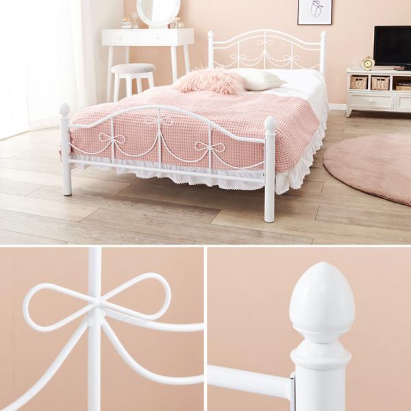 リボンの装飾をヘッド・フットボードにあしらった可愛いベッド。姫系家具やホワイトインテリアとも相性ぴったりです! 床面の高さは2段階の調節が可能。 かわいいヘッドボードが隠れる心配もありません。 床面は通気性のいいメッシュ床タイプ。 ベッド下は収納スペースとして活用できるので 収納場所が少ないひとり暮らしや子供部屋にもおすすめです。 耐荷重は90kgあるので、大人女子からお子様まで幅広い方にご使用いただけます。