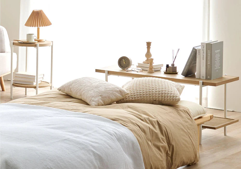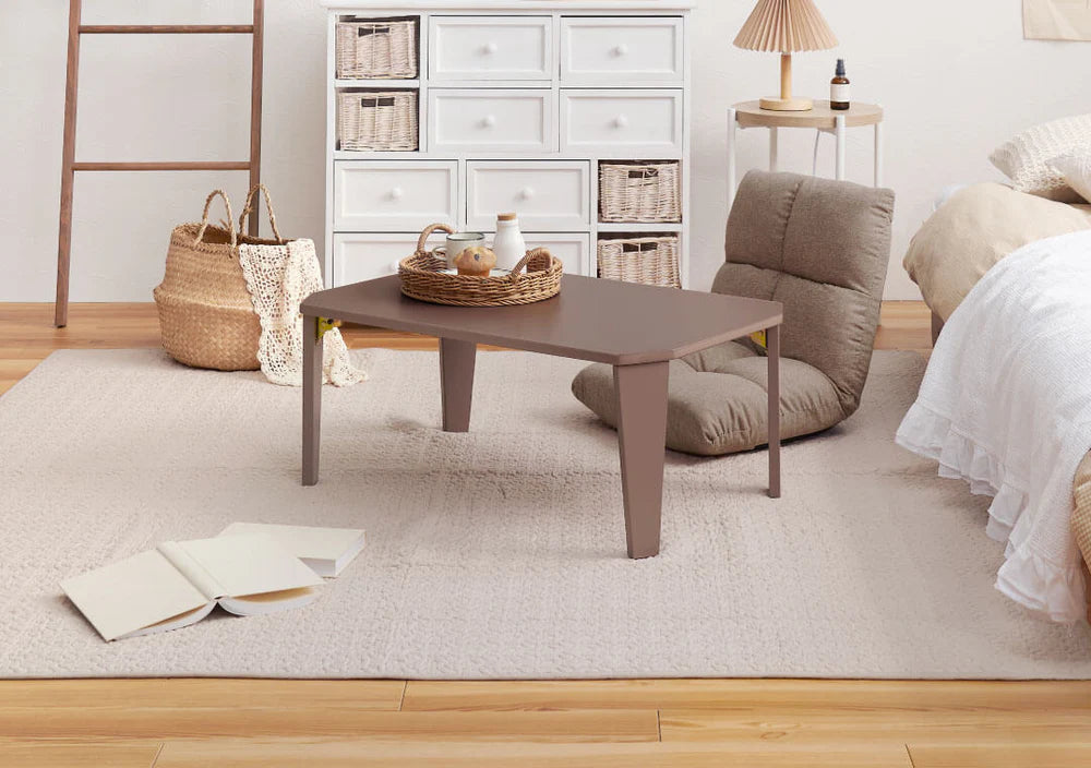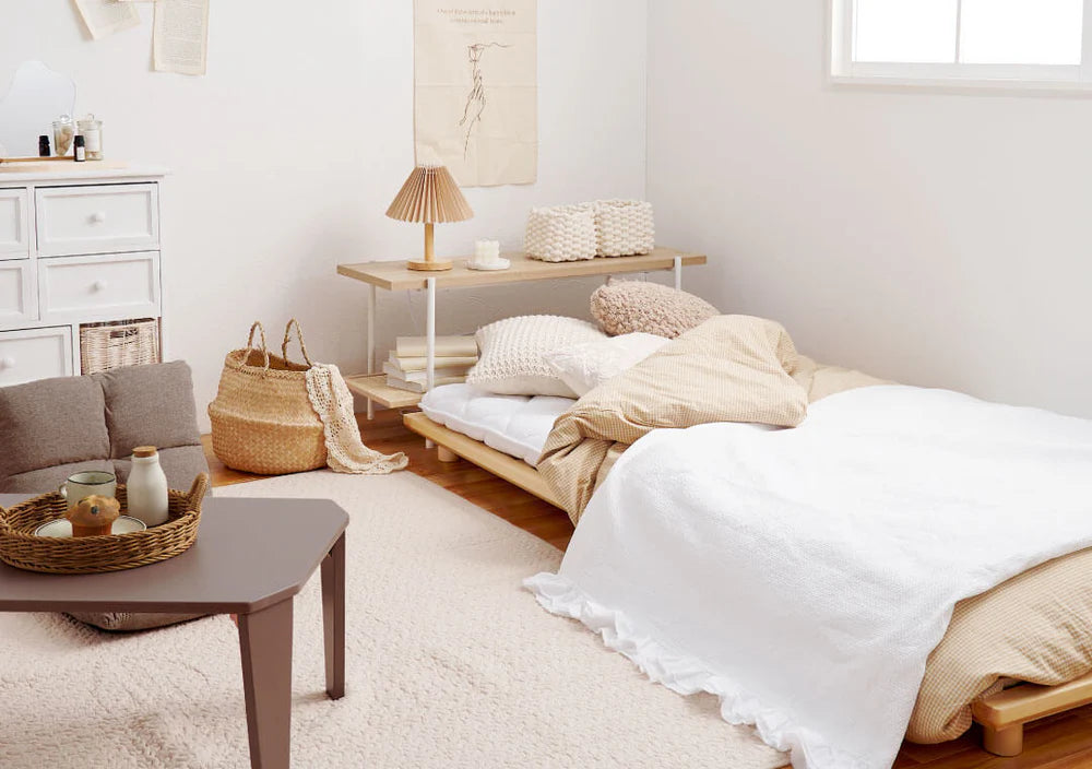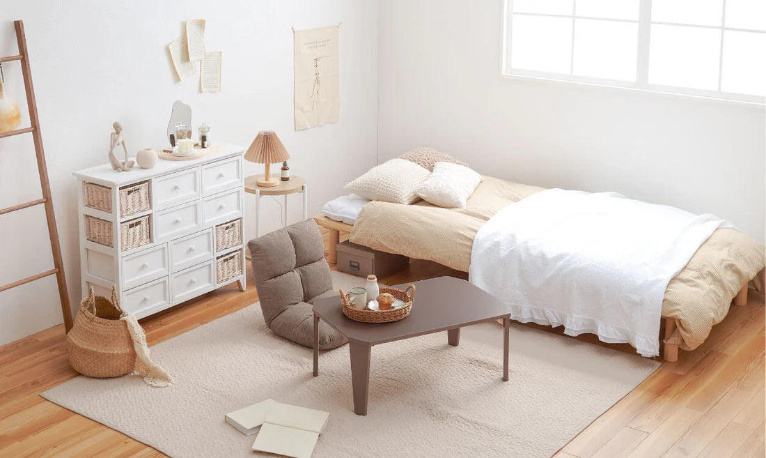 高さが調節できるベッドや、コンパクトな折りたたみテーブルと座椅子を取り入れてロースタイルに。