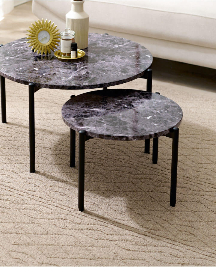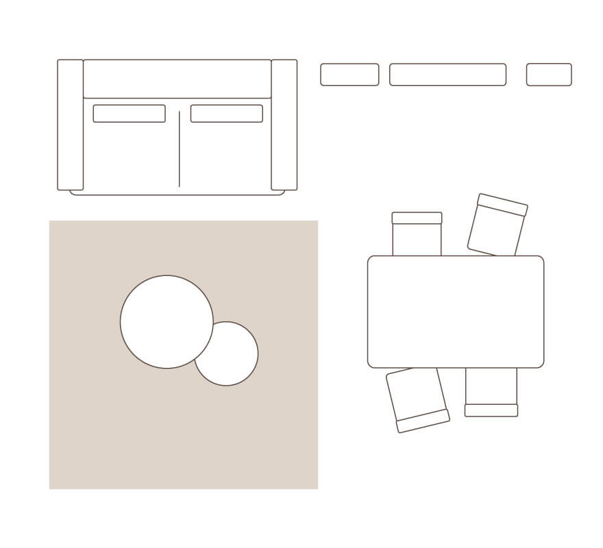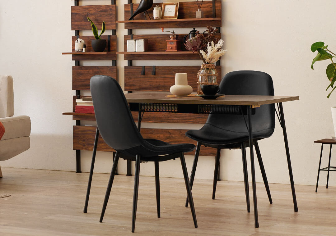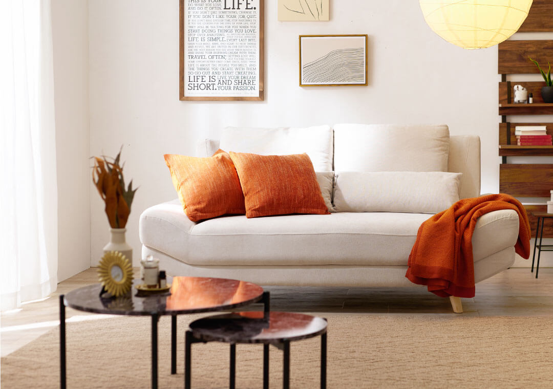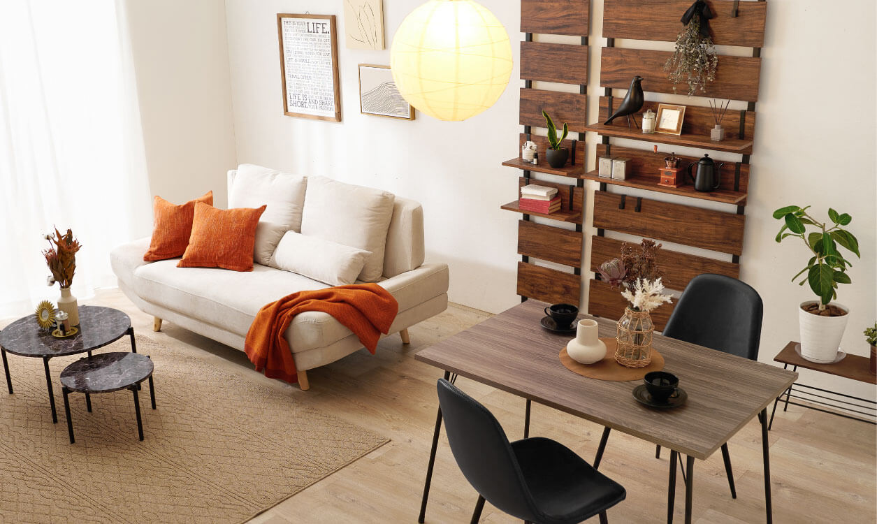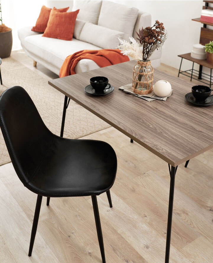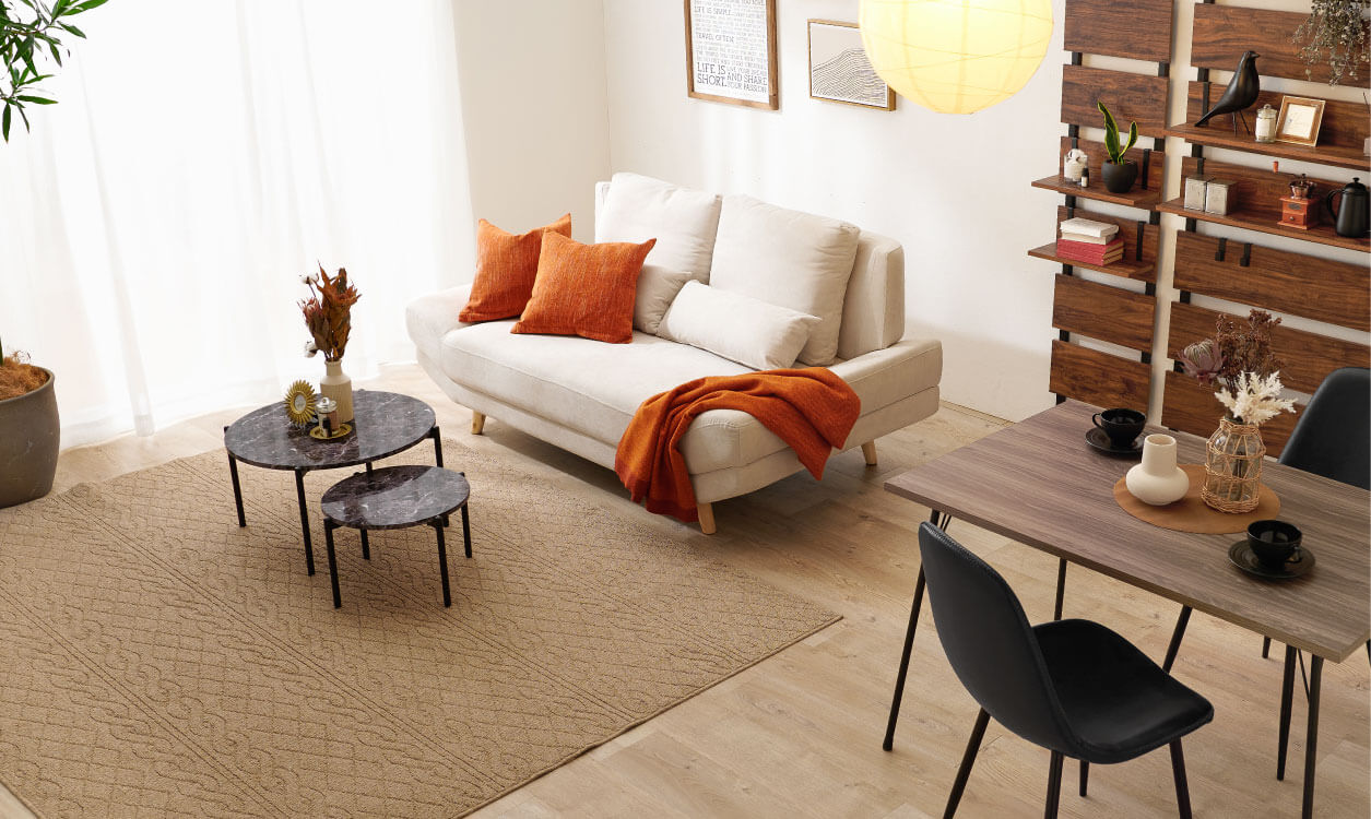 ・ブラウンやオレンジなど暖かみのある色味をベースに、スチール脚や大理石柄の家具で引き締まった空間に