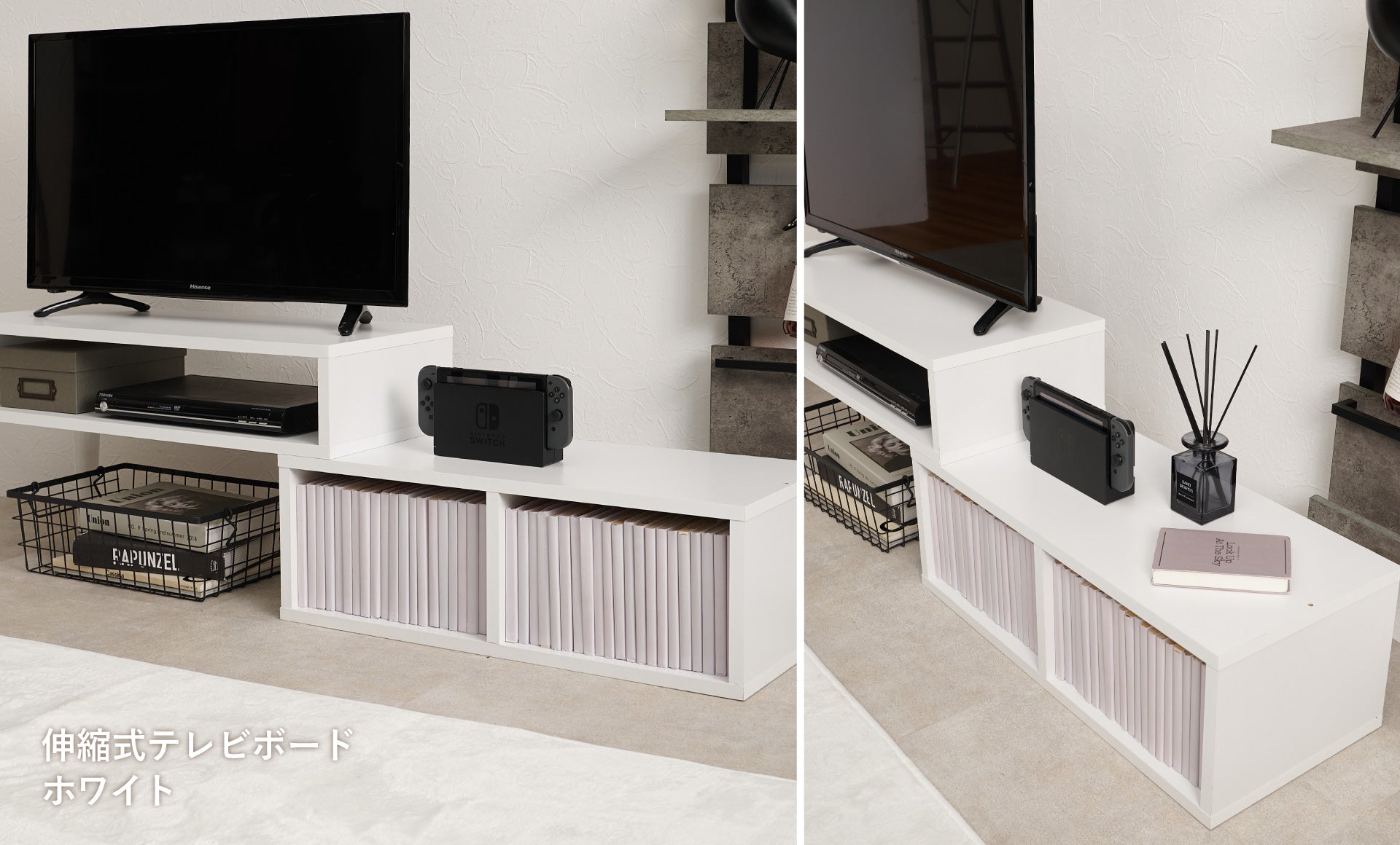 テレビ周りは趣味のアイテムを収納。