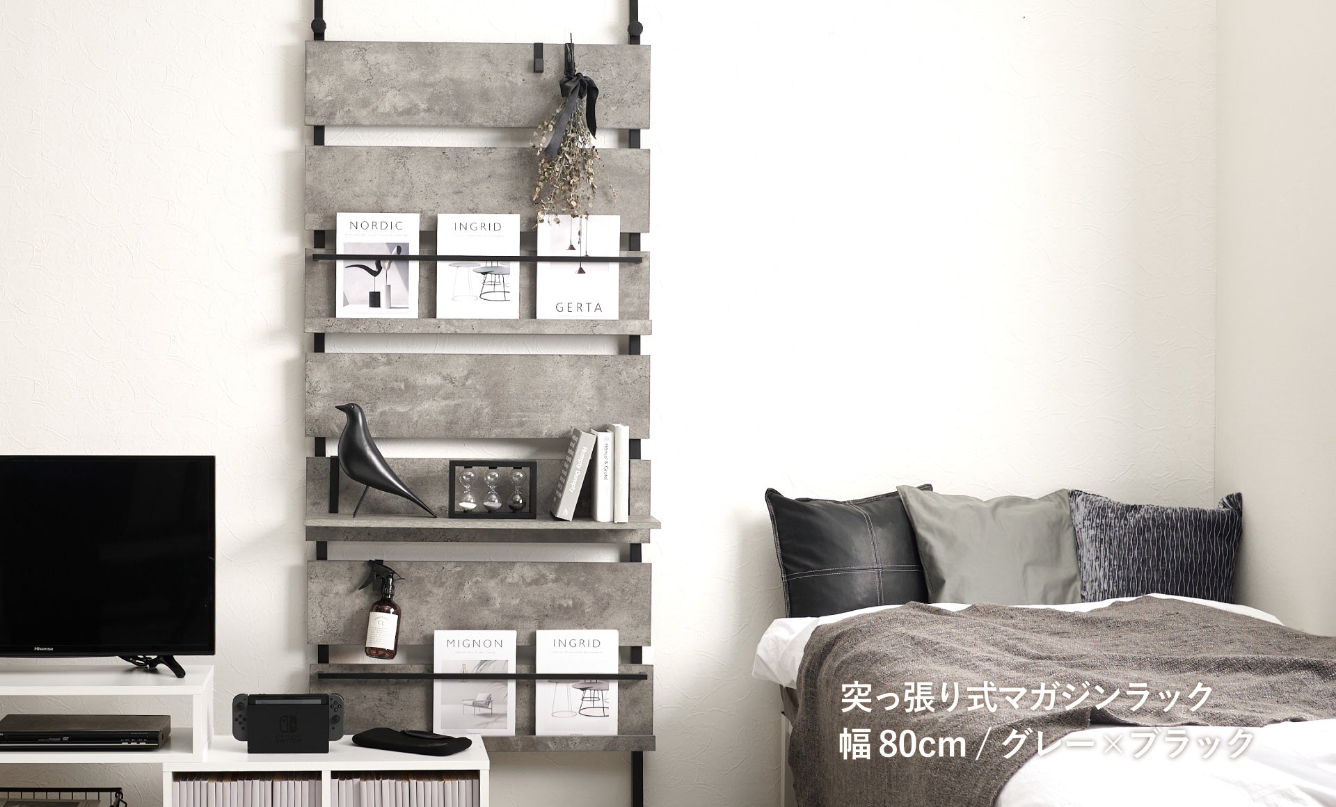 お気に入りの雑誌や小物の見せる収納に。
