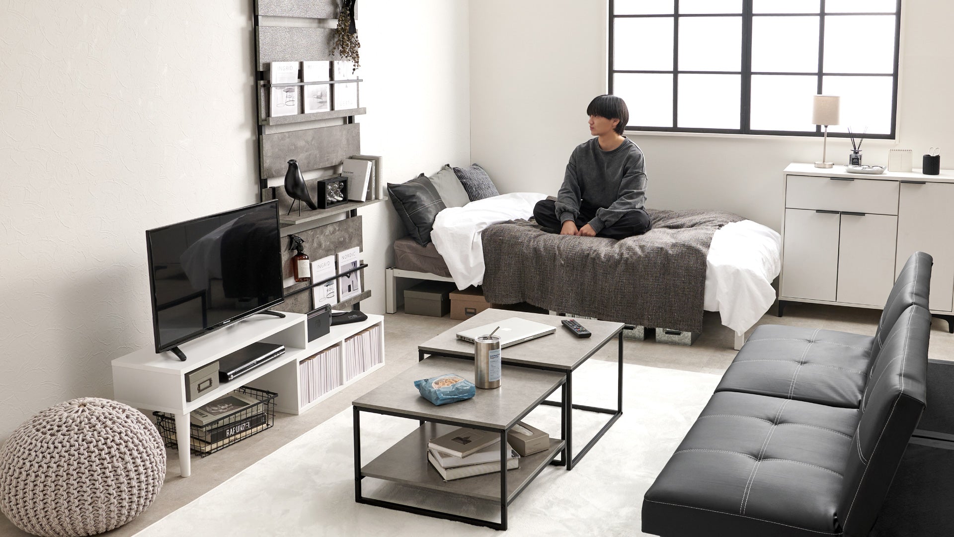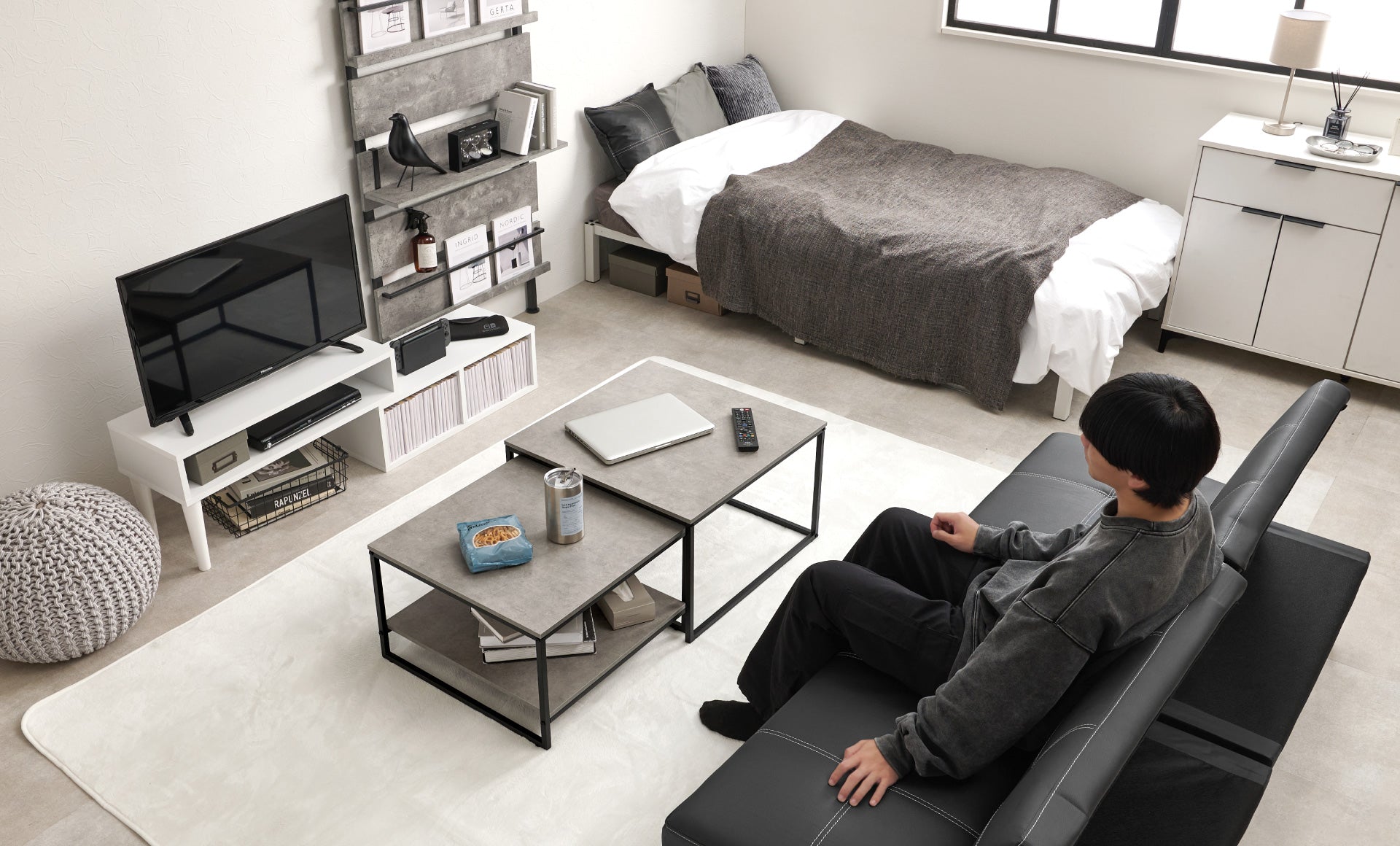 ・モノトーン家具でまとめることでスタイリッシュな印象に